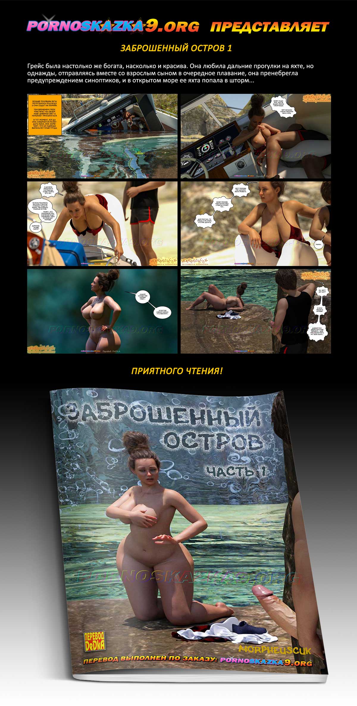 Порно комикс «Заброшенный остров. Часть 1.» Грейс была настолько же богата, насколько и красива. Она любила дальние прогулки на яхте, но однажды, отправляясь вместе со взрослым сыном в очередное плавание, она пренебрегла предупреждением синоптиков, и в открытом море ее яхта попала в шторм…